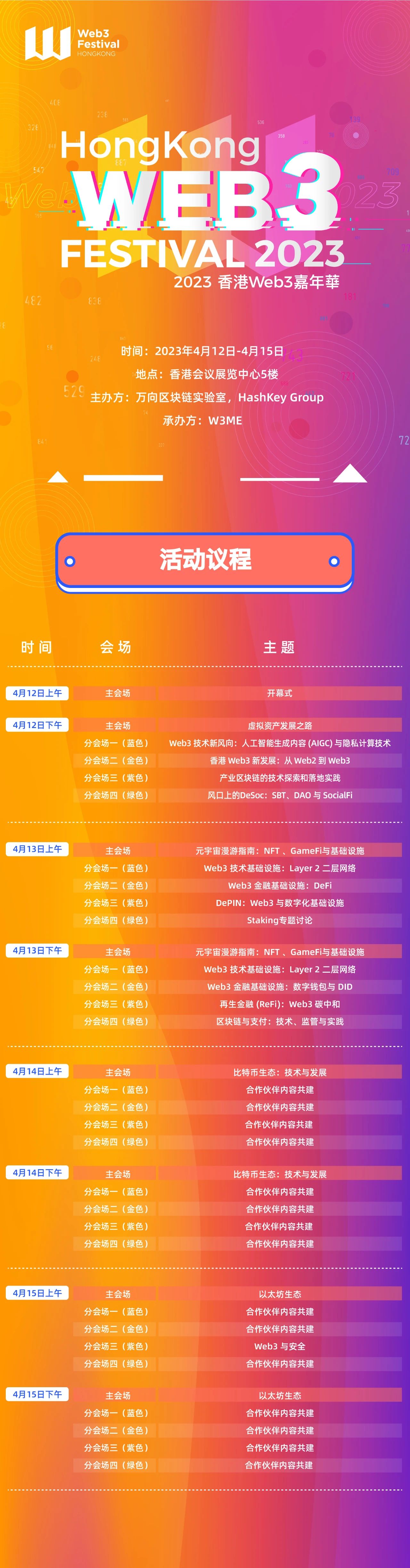Web3 Festival是由万向区块链实验室、HashKey Group联合推出的Web3活动品牌,由W3ME承办。首届嘉年华将于4月12日-15日,与香港贸发局主办的其他科技相关活动同期在香港会议展览中心举办。本次活动持续四天,包括5个会场,场地面积近9,000平方米,预计将吸引超过10,000现场观众,超过300位极具全球影响力的演讲嘉宾,以及超过百家热门Web3项目、社区及媒体现场参展。