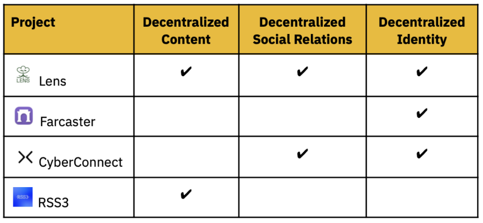 该部分的Web3项目试图提供一些定制的基础设施,以满足社交应用程序的需要。例如DeSo、Crossbell等。